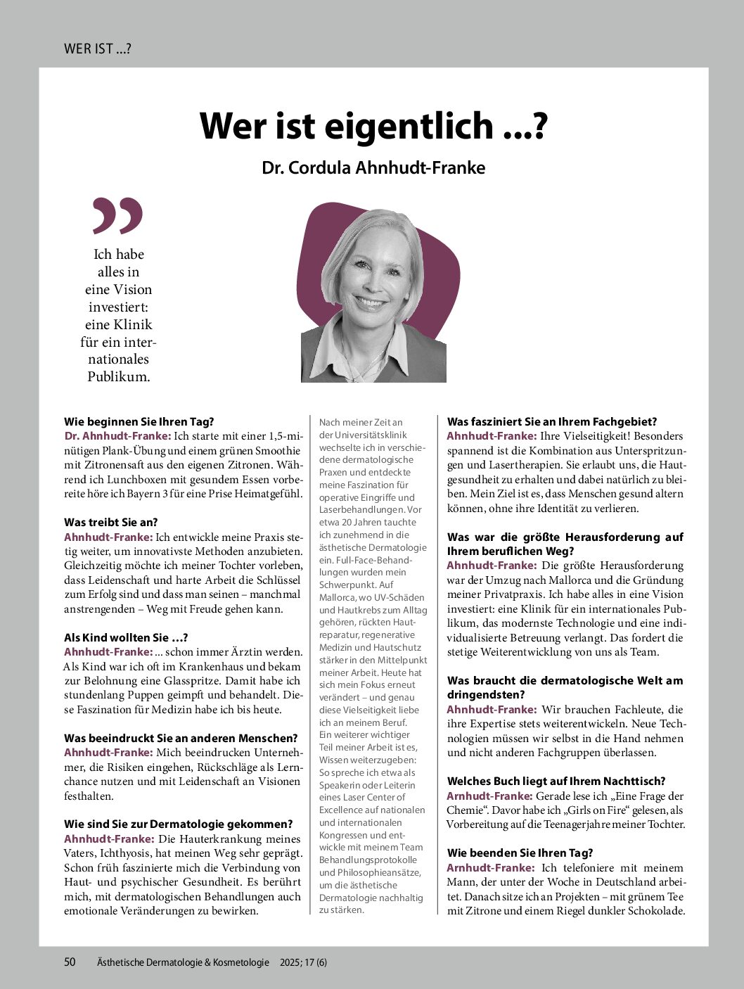 Dr Cordula is a regular contributor to the press and media, commenting on treatments and industry developments, reviewing products and featuring in case studies and patient stories.
